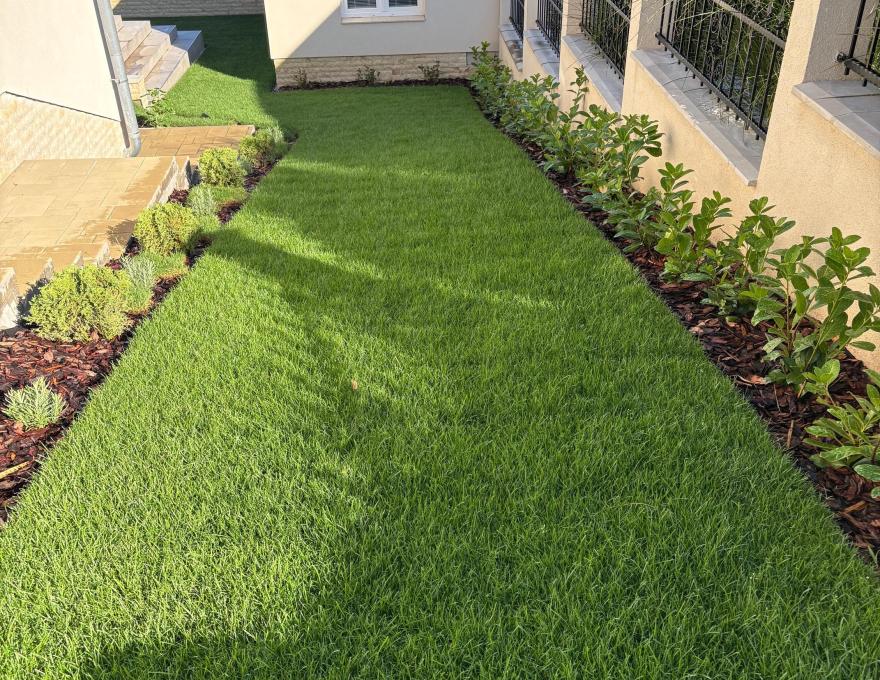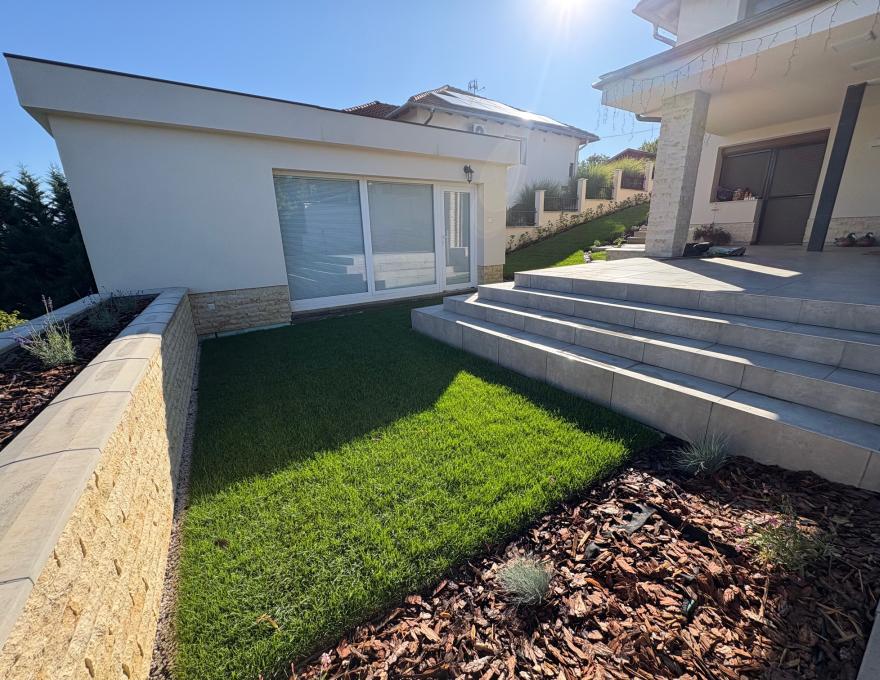 A teraszos, parkosított kertben automata öntözőrendszer gondoskodik a gyönyörű növényzetről. A kert felső részén egy hőszigetelt, többfunkciós kerti ház található, amely tárolásra, vendégháznak, vagy akár wellness célokra – például infra szauna elhelyezésére – is alkalmas. A kerti ház 14 m2, a terasz 30 m2.